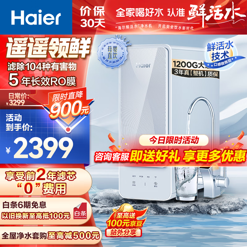 海尔(Haier)净水器玉净鲜活水1200G家用净水机大通量双出水厨下式5年RO反渗透直饮双出水过滤器 HRO12H69价格:2399.00元!