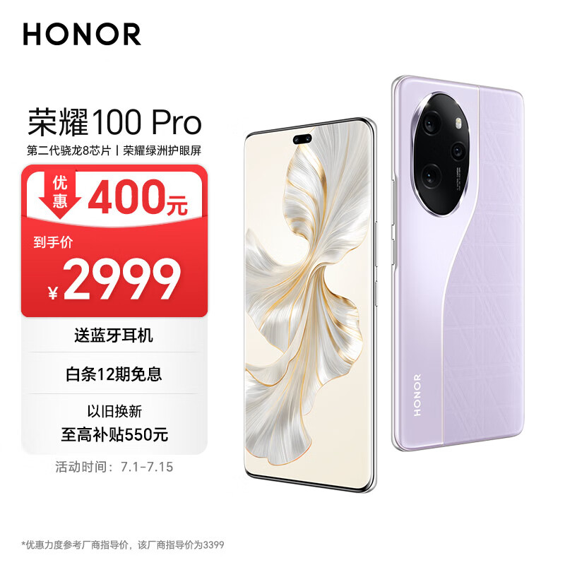 荣耀100 Pro 单反级主摄 荣耀绿洲护眼屏 第二代骁龙8旗舰芯片 AI手机 12+256 莫奈紫 5G价格:2999.00元!