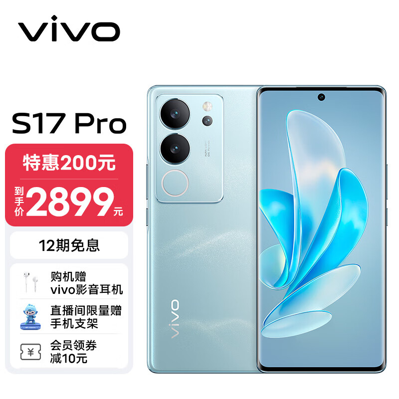 vivo S17 Pro 12GB+256GB 山海青 前置5000万广角柔光 专业长焦人像镜头 天玑8200旗舰芯片 5G 快充 拍照手机价格:2899.00元!