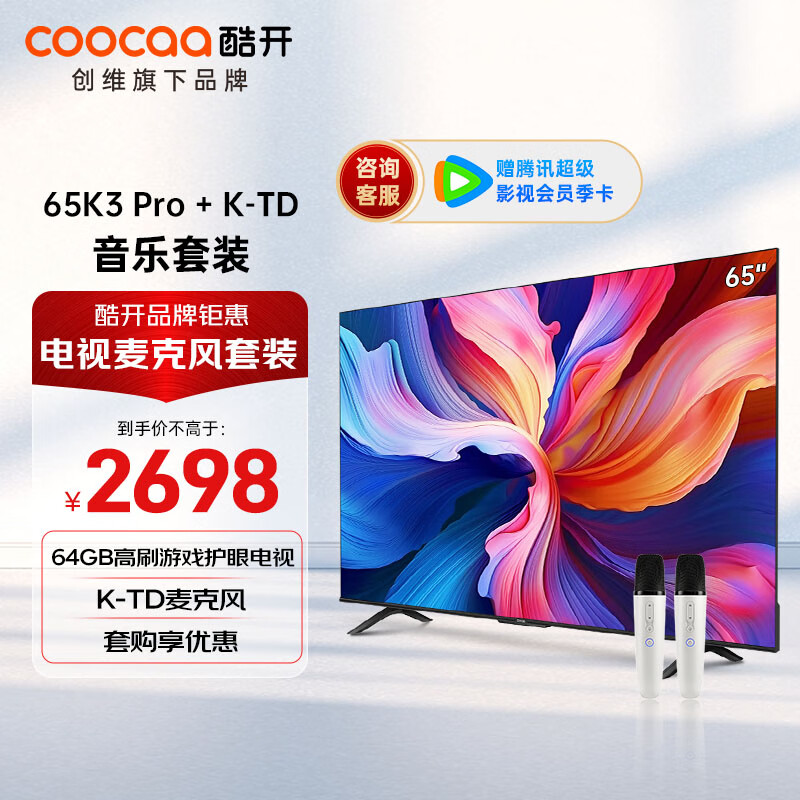 酷开创维 65英寸高刷电视机K3 Pro+K-TD麦克风套装 K歌电视 家庭KTV无线降噪话筒唱歌会议 双支麦克风价格:2698.00元!