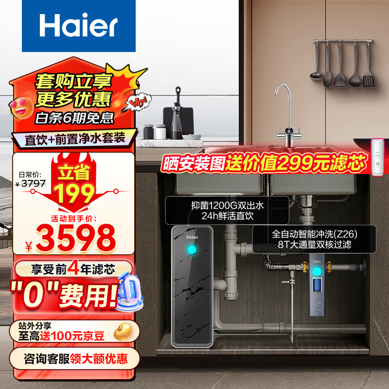 海尔(Haier)净水器1200G鲜活水双出水 pro家用净水机反渗透大通量厨下直饮+前置过滤器HKC3000-R880D2U1+Z26价格:3598.00元!