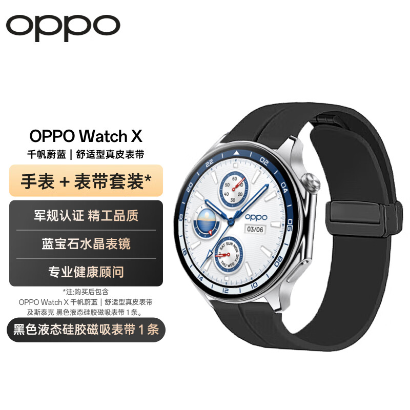 OPPO Watch X 千帆蔚蓝 全智能手表 运动健康手表 男女eSIM电话手表+黑色硅胶磁吸表带套装价格:2517.00元!
