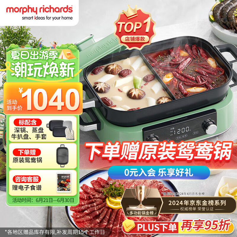 摩飞电器(Morphyrichards)多功能锅 家用电火锅电蒸锅 5升可预约 大功率分体式蒸煮一体不沾煎烤料理锅 MR9099 薄荷绿价格:1040.00元!