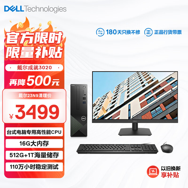 戴尔(Dell)成就3020 台式电脑主机(酷睿13代i3-13100 16G 512GSSD+1TB)23.8英寸大屏显示器 高性能CPU价格:3499.00元!