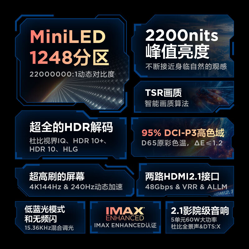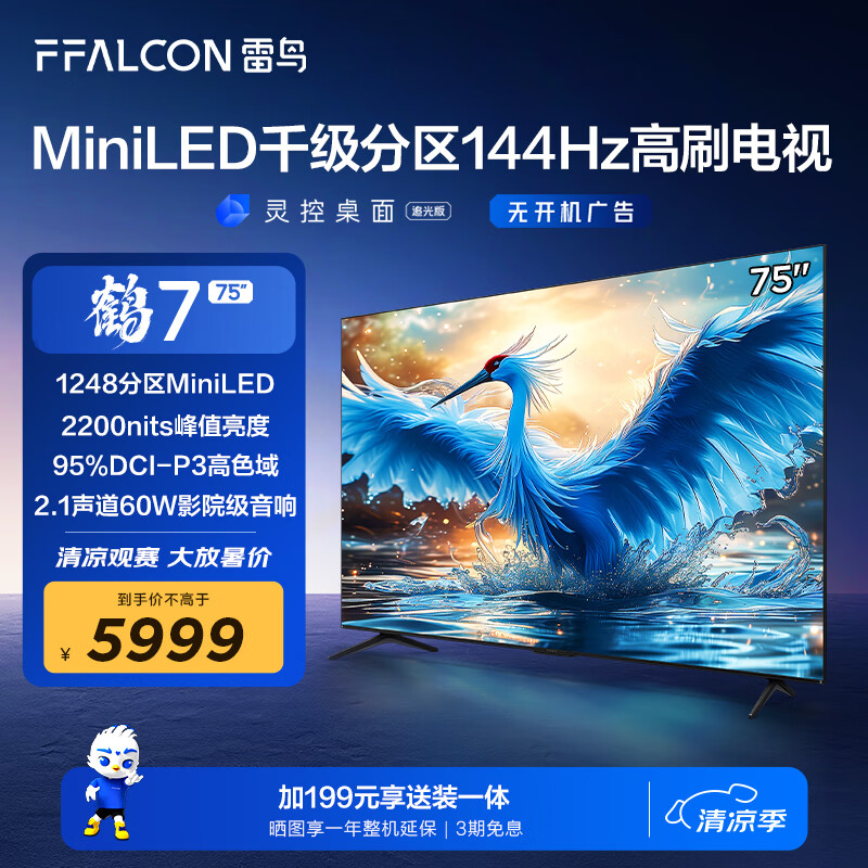 FFALCON雷鸟 鹤7 24款 75英寸 Mini LED 2200nits 1248分区 144Hz高刷 智能液晶平板电视机75R685C价格:5999.00元!