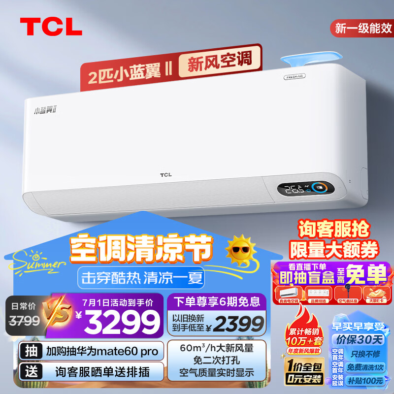 TCL 新风空调2匹新一级变频60?/h大新风量 小蓝翼Ⅱ智能空调挂机KFRd-46GW/D-SWA11Bp(B1)一价全包价格:3180.00元!