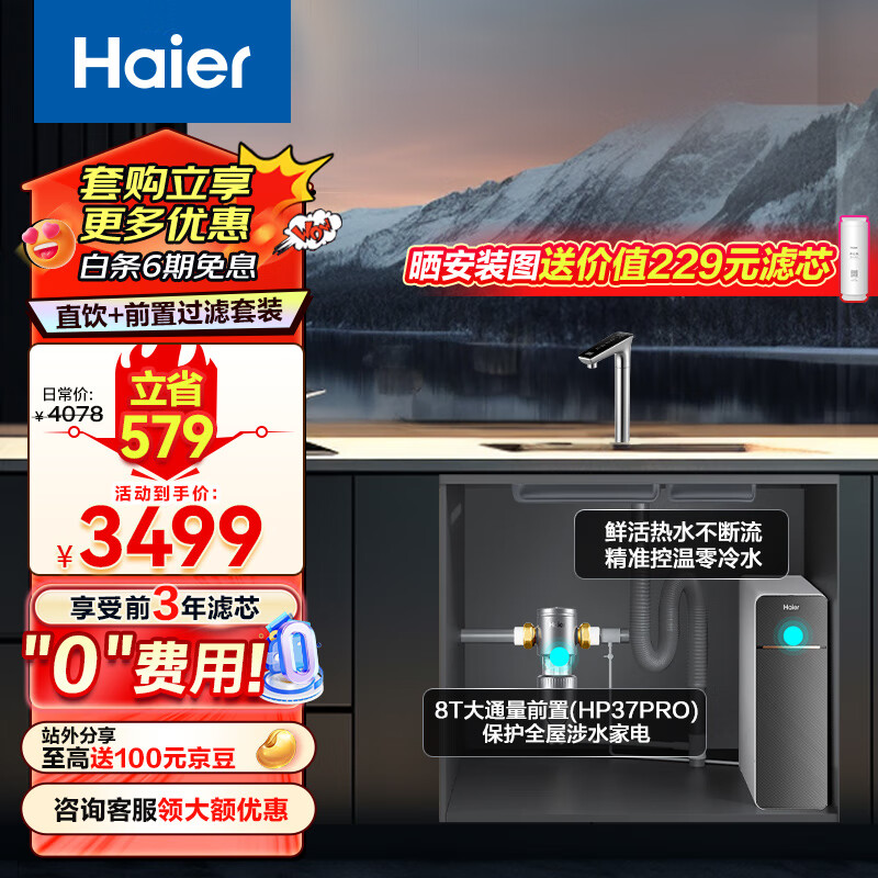 海尔(Haier)鲜活水净热一体加热直饮机家用净水器即热厨下式RO反渗透+前置过滤器HKC1560-R995D2HU1+HP-37PRO价格:3499.00元!