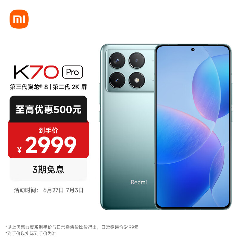 小米Redmi K70 Pro 第三代骁龙8小米澎湃OS 16GB+256GB 竹月蓝 红米5G手机 SU7小米汽车互联 AI手机价格:2999.00元!
