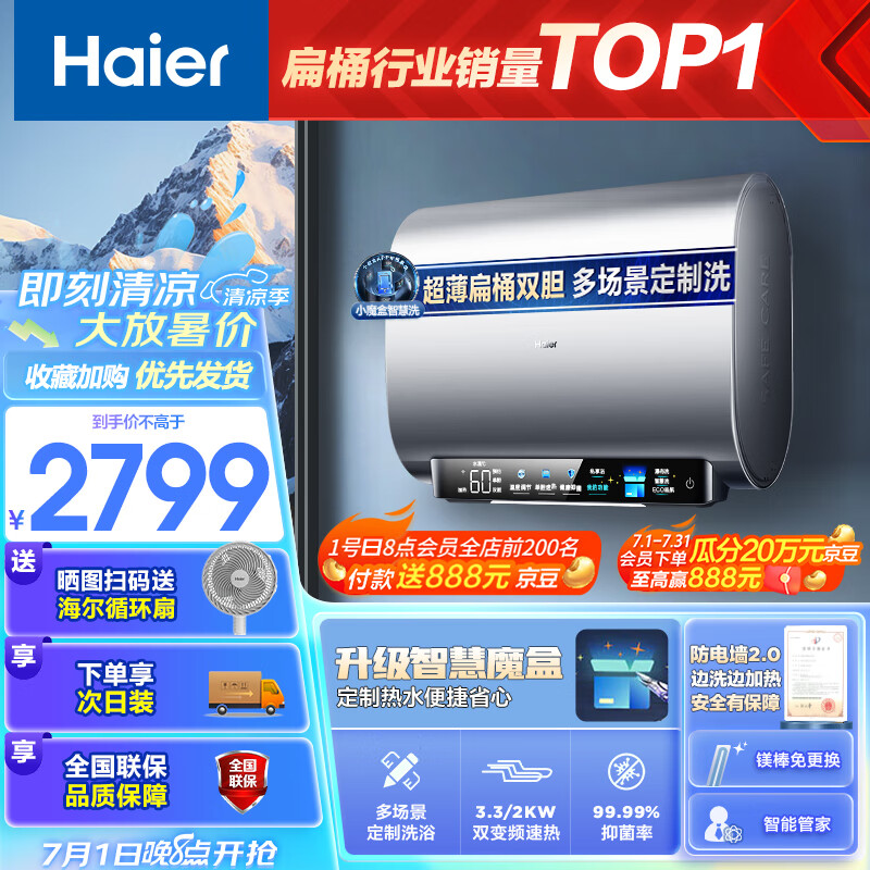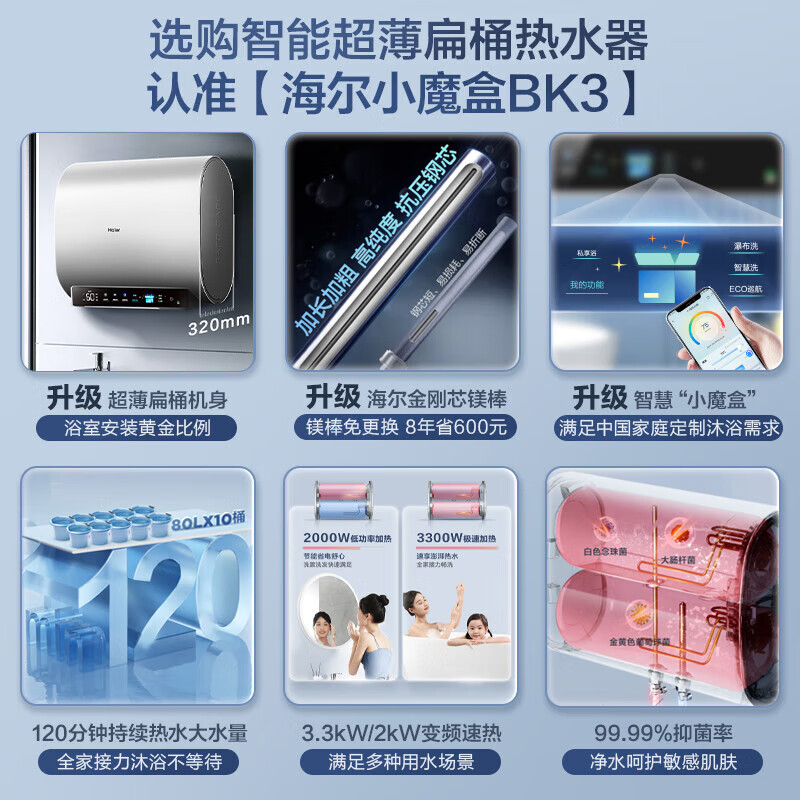海尔(Haier)80升【小魔盒BK3】定制浴超薄扁桶双胆家用电热水器3300W变频速热免换镁棒EC8003-BK3U1 以旧换新价格:2999.00元!
