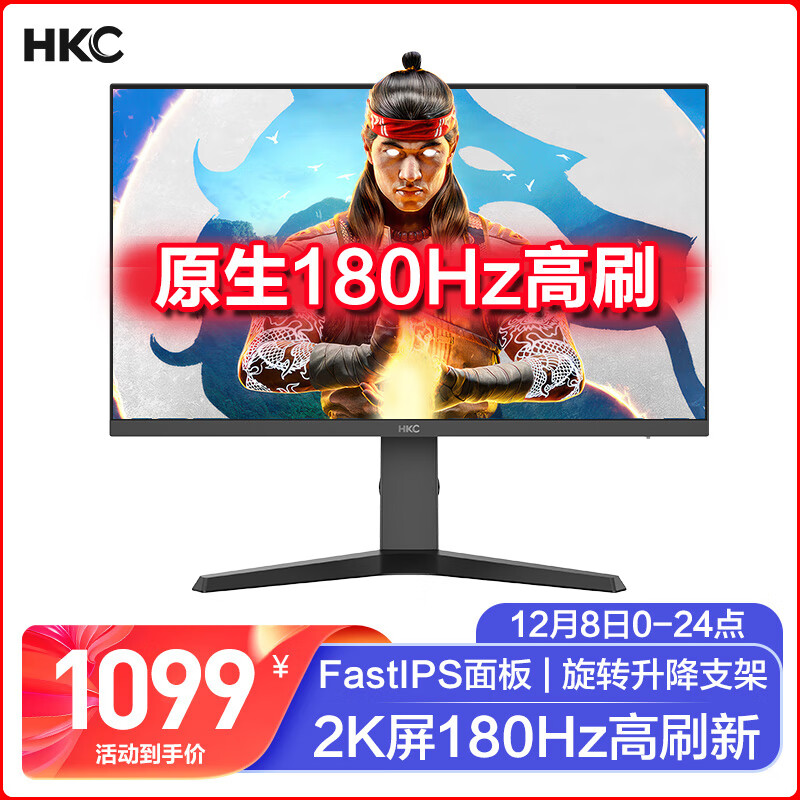 HKC 27英寸2K 180Hz FastIPS快速液晶显示屏 1ms 高清广色域旋转升降窄边框 专业电竞游戏电脑显示器 VG273QS价格:1499.00元!