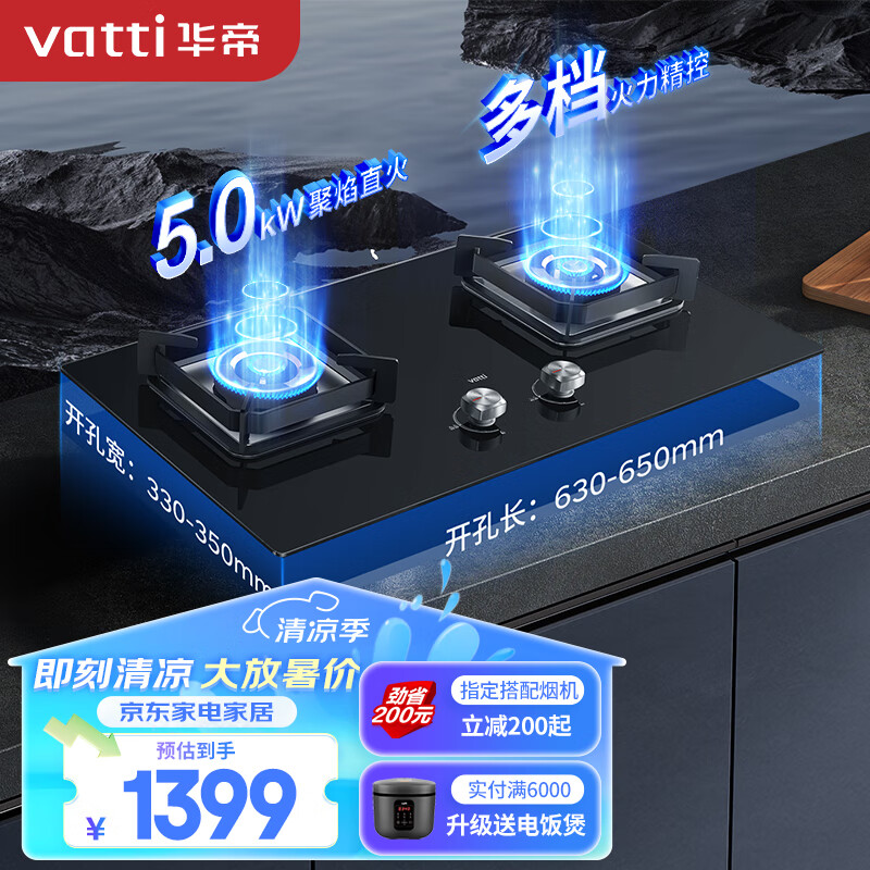 华帝(VATTI)燃气灶家用5.0kW大火力高热效易打理猛火灶台式嵌入式两用煤气灶双灶台灶具JZY-i10072B(液化气)价格:1399.00元!