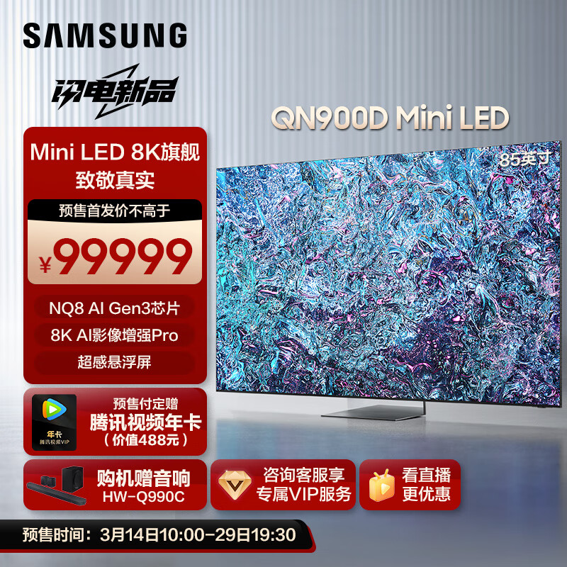 三星(SAMSUNG)85QN900D 85英寸 8K QLED电视 屏 人工智能 教育资源 无开机广告 QA85QN900DJXXZ 价格:99999.00元!