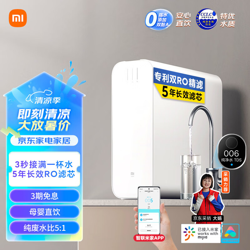 米家小米双核净水器1200G家用净水机 厨下式直饮机 无罐直饮水 5年长效RO滤芯 5:1纯废水比 3.2L/分价格:2799.00元!
