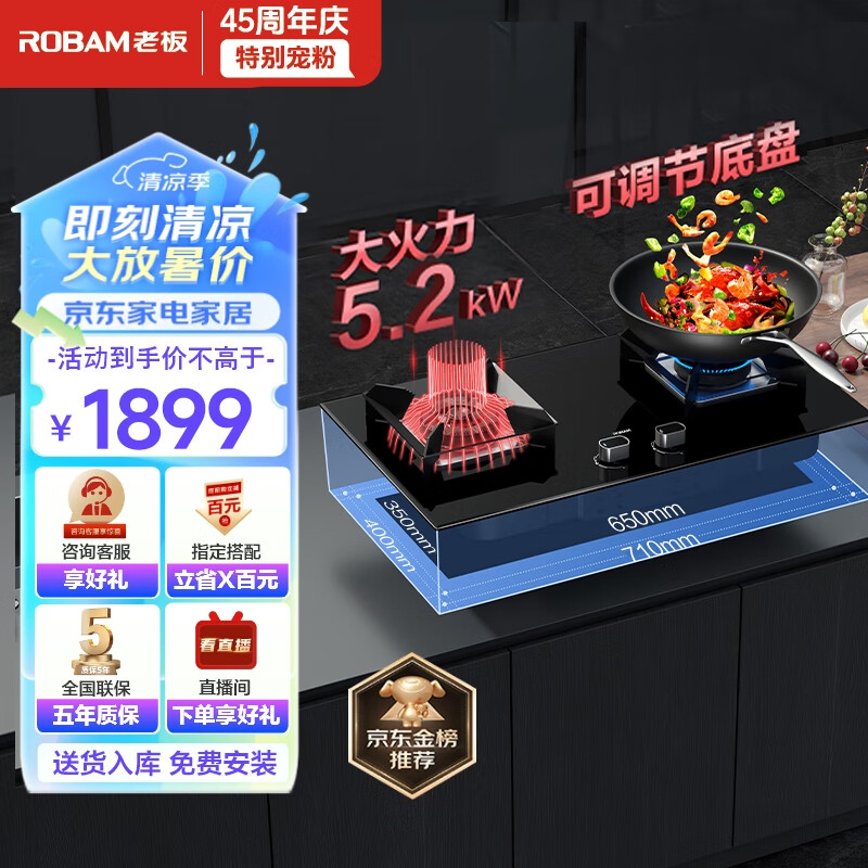 老板(Robam)JZT-57B2D家用大火力嵌入式燃气灶5.2kW 钢化玻璃易清洁 可调节底盘 高热效(天然气)价格:1899.00元!