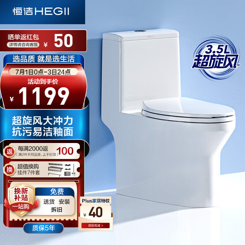 恒洁(HEGII)马桶561 超旋风大冲力虹吸式家用节水坐便器HC0561DT-305价格:1699.00元!