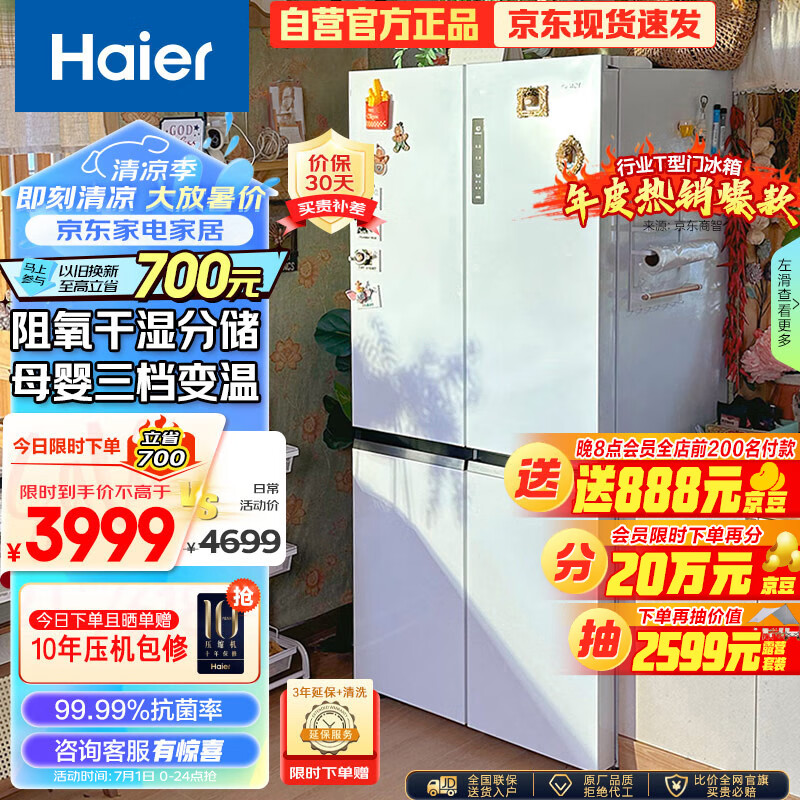 海尔(Haier)549升十字双开对开四开门电冰箱家用一级能效变频节能嵌入式超大容量545升级款BCD-549WGHTD58WV价格:3999.00元!
