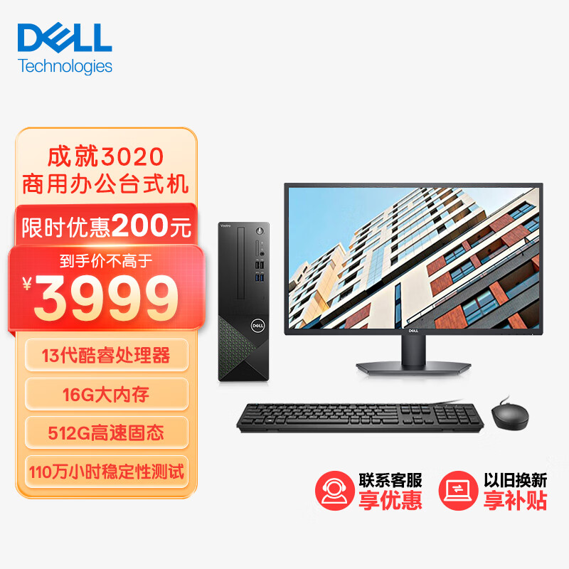 戴尔(Dell)成就3020 台式电脑主机 高性能整机 (13代i5-13400 16G 512GSSD三年上门)27英寸大屏显示器价格:3999.00元!