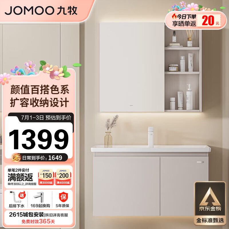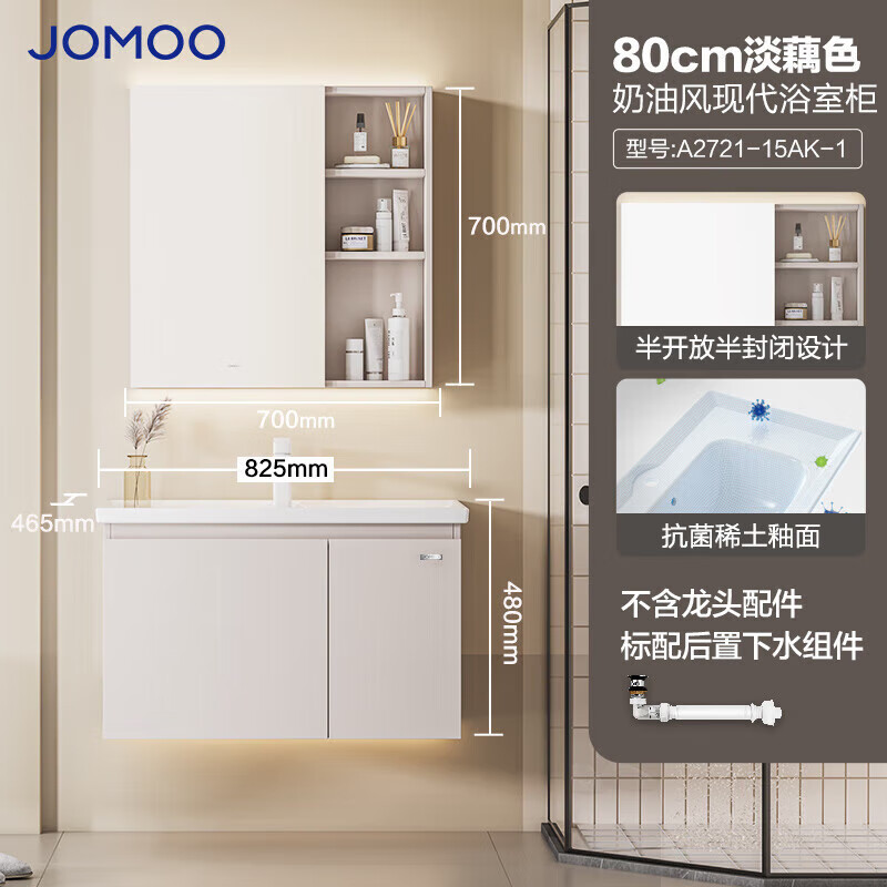 九牧(JOMOO)浴室柜 陶瓷一体盆抗菌悬挂洗脸盆柜组合淡藕色80cm A2721-15AK-1价格:1699.00元!