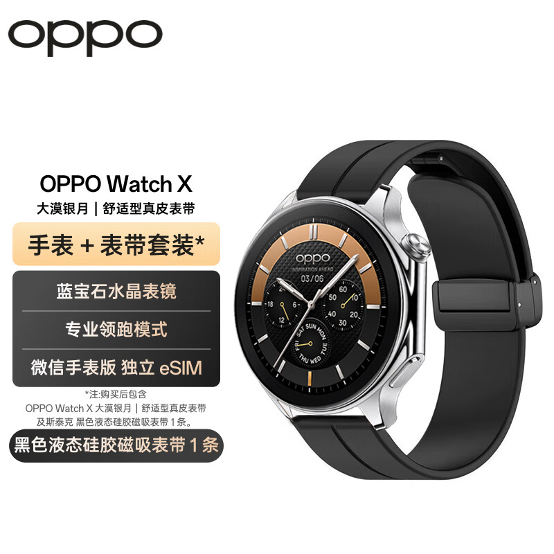 OPPO Watch X 大漠银月 全智能手表 运动健康手表 男女eSIM电话手表+黑色硅胶磁吸表带套装价格:2417.00元!