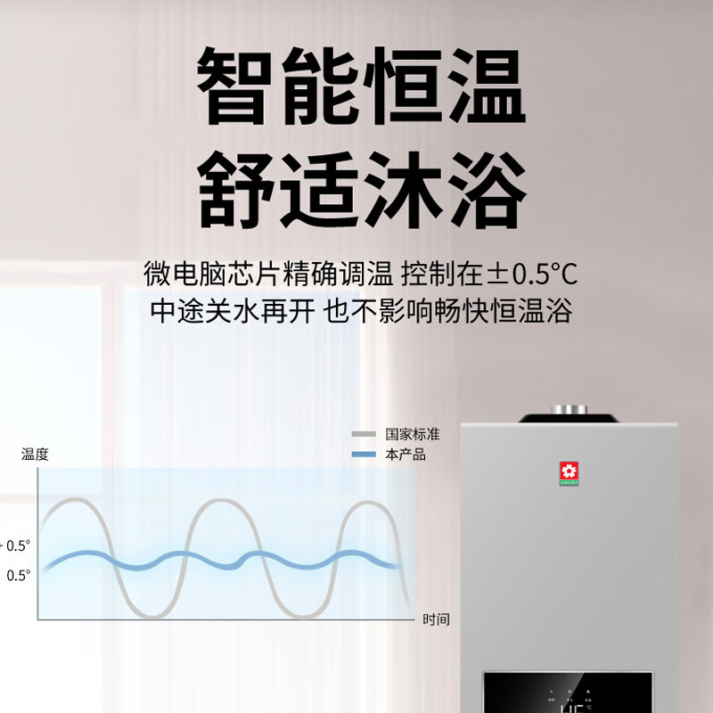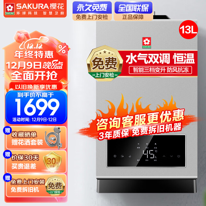 樱花(SAKURA)13升燃气热水器家用 水气双调精控恒温 智能三档变升 防风抗冻 天然气 JSQ25-JSY502A价格:1899.00元!