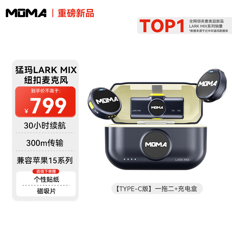 猛玛(MOMA)Lark Mix 一拖二无线领夹麦克风猛犸手机直播vlog户外采访微小型纽扣收音麦Type-C版黑色价格:799.00元!
