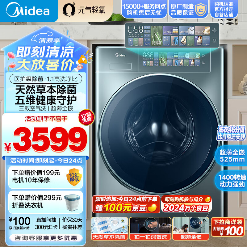 美的(Midea)滚筒洗衣机全自动 AIR5 元气轻氧系列 MD100SAIR 洗烘一体机 天然草本除菌 超薄全嵌 1.1洗净比价格:3599.00元!