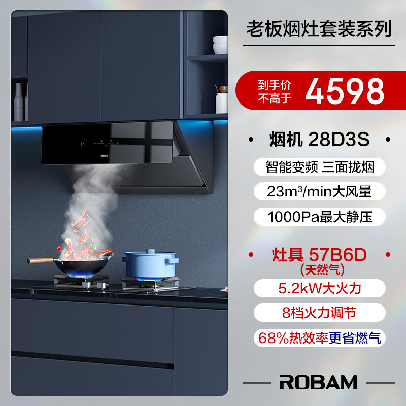 老板(Robam)抽油烟机探索家D3S家用变频烟机燃气灶烟灶套装23m3/min侧吸吸油烟机灶具28D3S+57B6D天然气价格:4598.00元!
