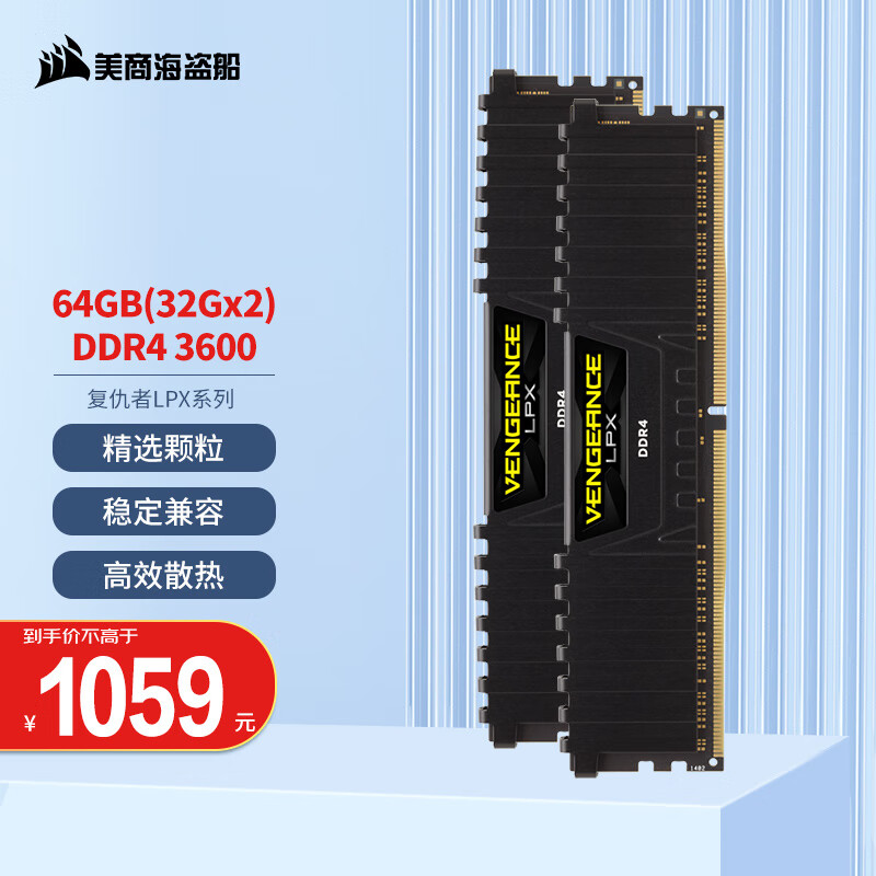 美商海盗船(USCORSAIR)64GB(32G×2)套装 DDR4 3600 台式机内存条 复仇者LPX系列 游戏型价格:1059.00元!