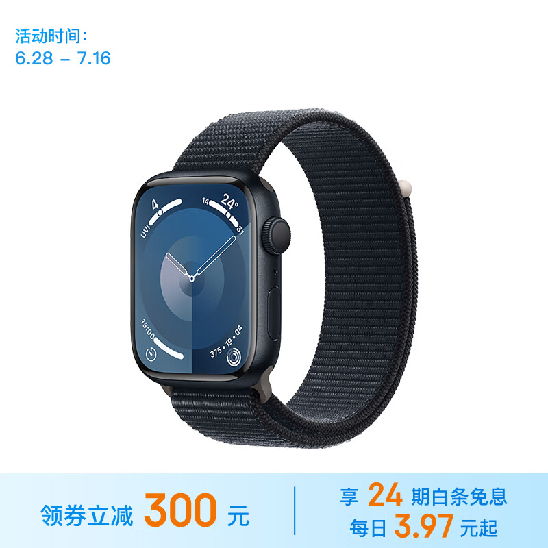 Apple【24期免息】Watch Series 9智能手表GPS款45毫米午夜色铝金属表壳午夜色回环表带MR9C3CH/A价格:3199.00元!