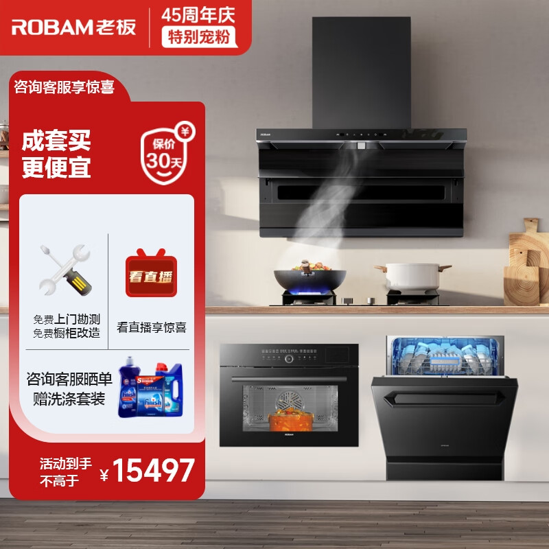 老板(Robam)油烟机家用小黑翼顶侧双吸抽油烟机25风量油烟机灶具蒸烤一体机洗碗机D1+57B2D+F80D黑+CQ9062D价格:15497.00元!