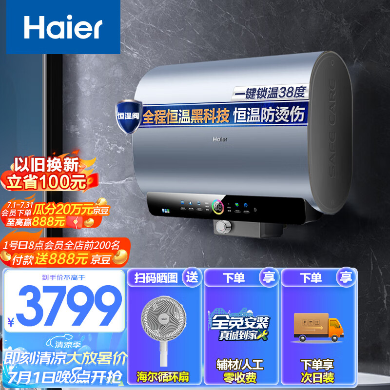 海尔(Haier)60升全程恒温超薄扁桶双胆家用电热水器大水量3000W速热免换镁棒一级能效 EC6003-WARM7U1以旧换新价格:4199.00元!