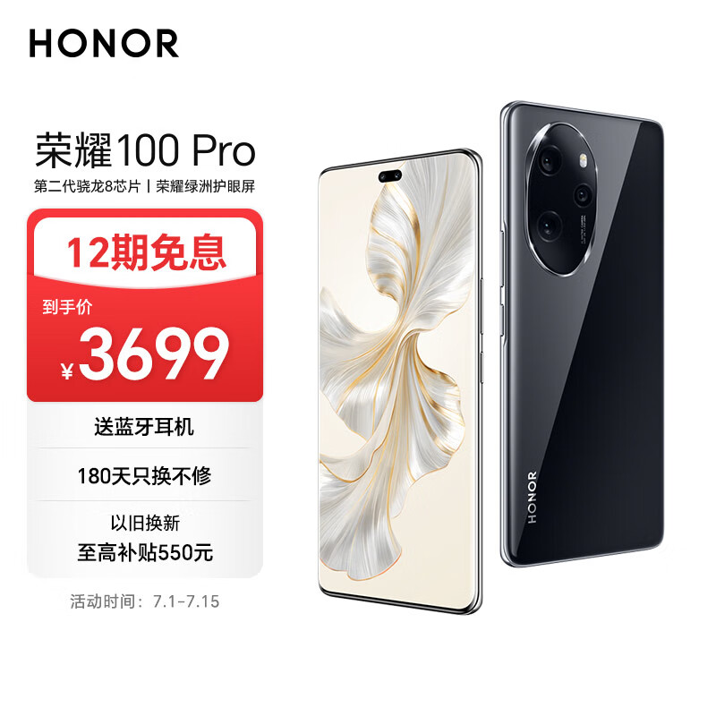 荣耀100 Pro 单反级主摄 荣耀绿洲护眼屏 第二代骁龙8旗舰芯片 AI手机 16+256 亮黑色 5G价格:3699.00元!