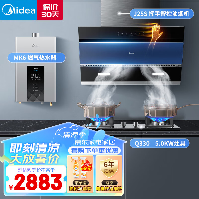 美的(Midea)【烟灶热水器套购】侧吸式21大吸力5.0kW火力烟灶J25S+Q330天然气搭16升热水器MK6价格:2999.00元!