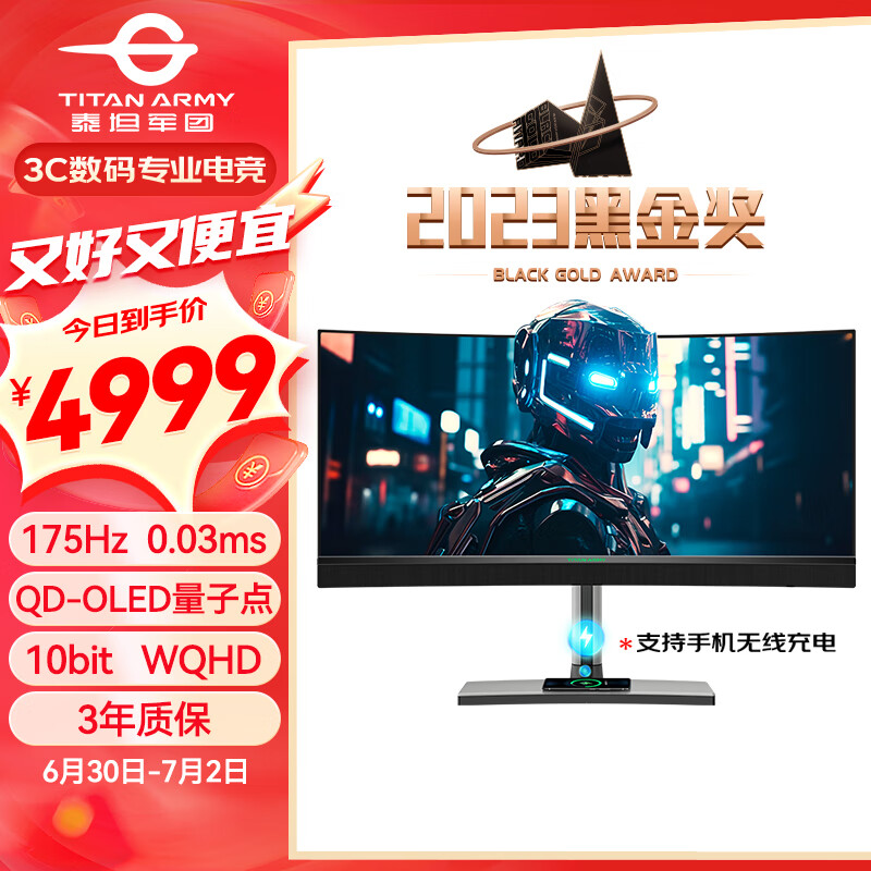泰坦军团34英寸 OLED 175Hz WQHD带鱼屏 0.03ms 10bit 无线充底座 HDR 智能分屏 KVM 电竞电脑显示器M34E9R价格:4999.00元!
