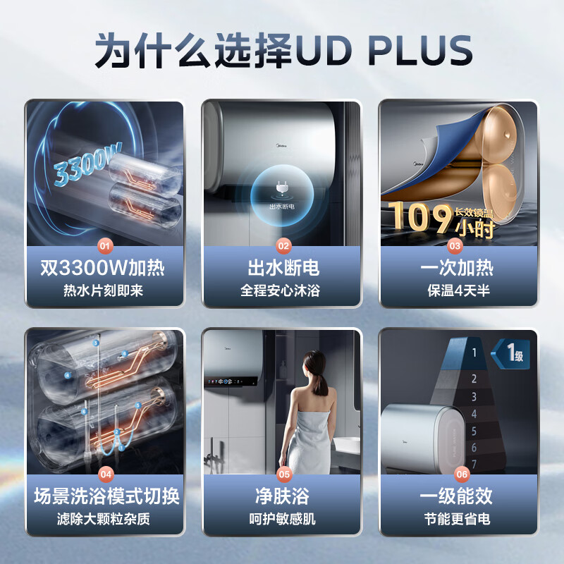 美的(Midea)60升玲珑超薄双胆扁桶电热水器3300W变频 镁棒免换出水断电净肤F6033-UDplus一级能效以旧换新价格:2499.00元!