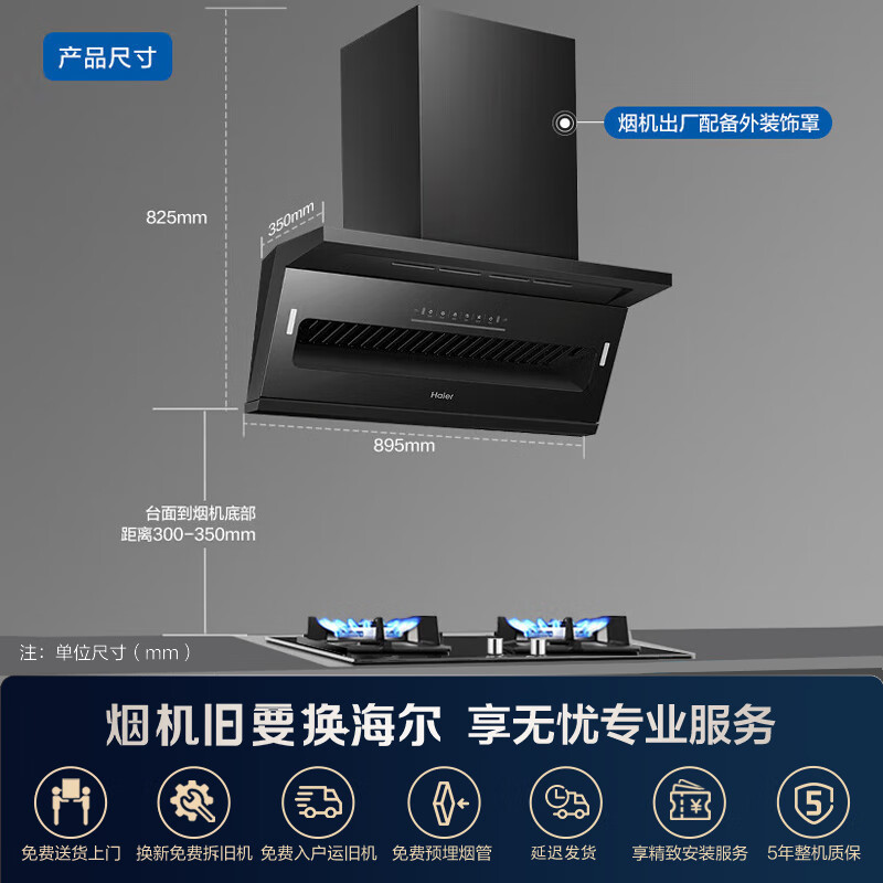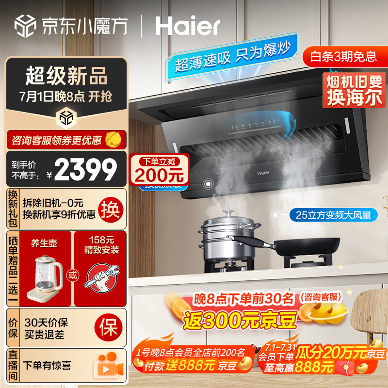 海尔(Haier)抽油烟机 顶侧双吸 7字型家用排烟机 25m3/min大吸力 齐平橱柜 挥手智控 自动清洗排吸烟机C61价格:2599.00元!