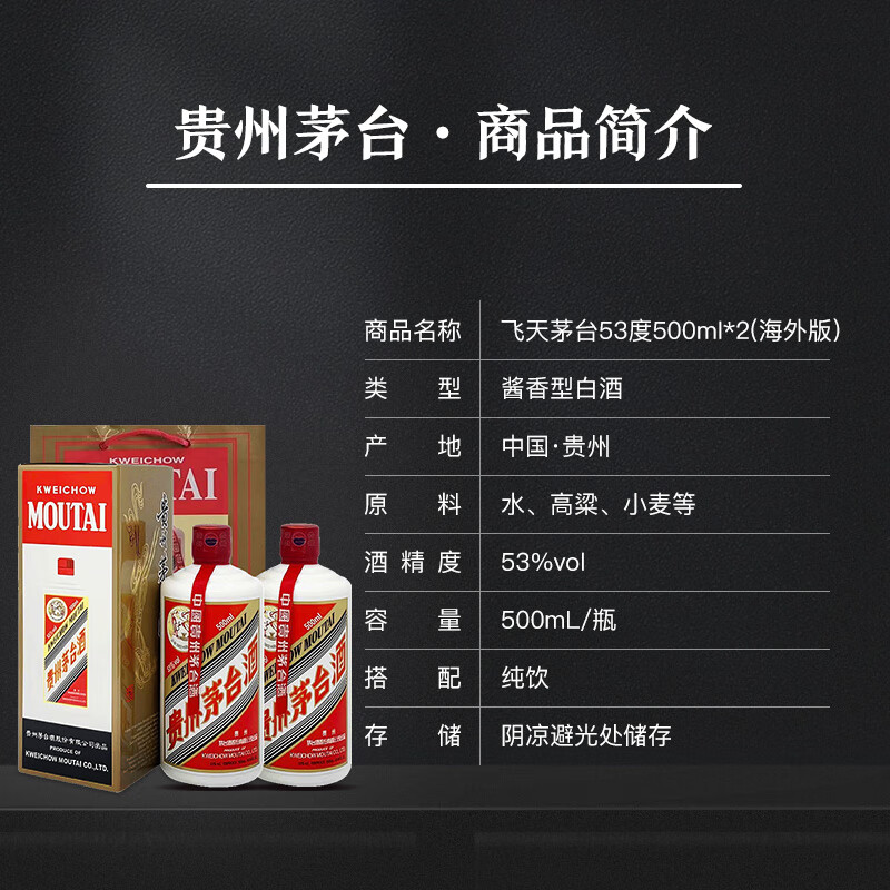 茅台(MOUTAI)飞天 53度 酱香型白酒 500ml*2 海外版送礼袋年货送礼价格:4738.00元!