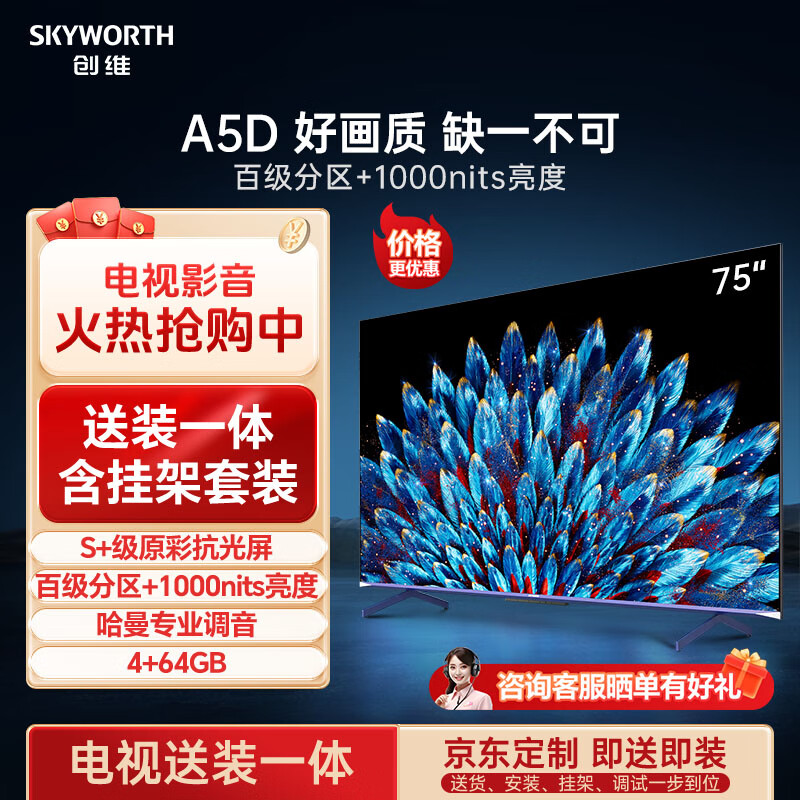 创维电视75A5D【送装一体版本】75英寸电视机百级分区4+64G哈曼调音一级能效护眼平板巨幕大屏游戏电视价格:5198.00元!
