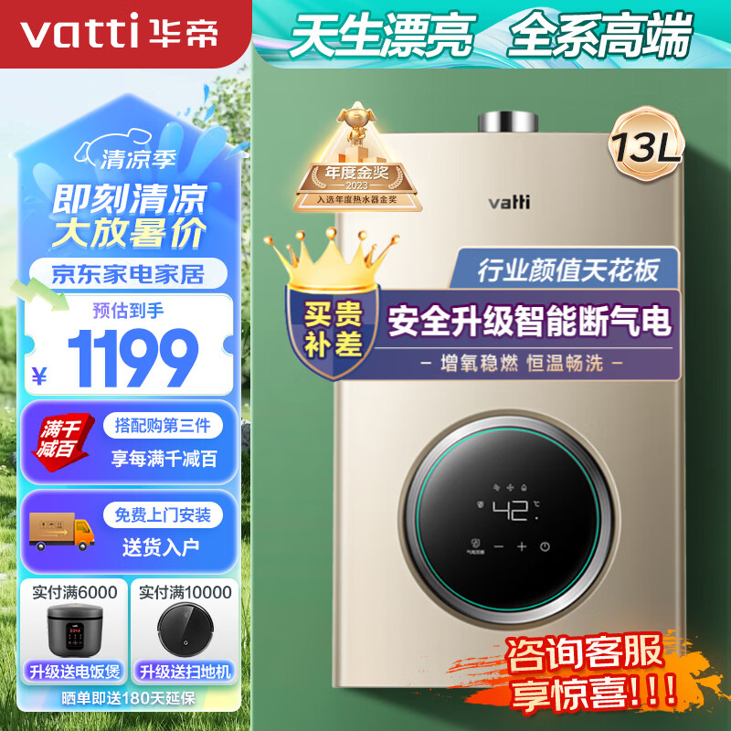 华帝(VATTI)13升燃气热水器天然气节能省气智能恒温气电双断多重防冻低水压启动金色家用i12104-13 以旧换新价格:1199.00元!