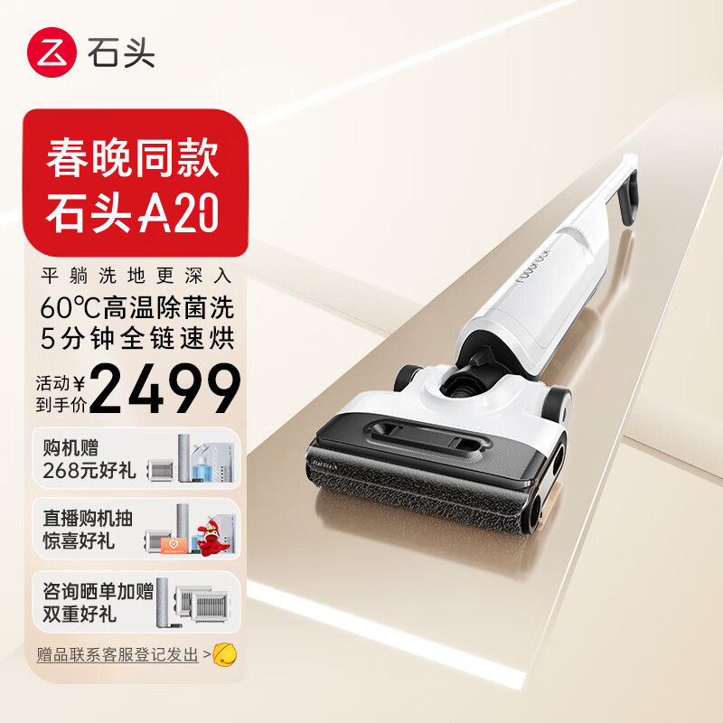 石头(roborock)智能洗地机A20 平躺洗地高温热水自清洁全链速烘家用无线扫地吸尘洗拖一体拖地机价格:2499.00元!
