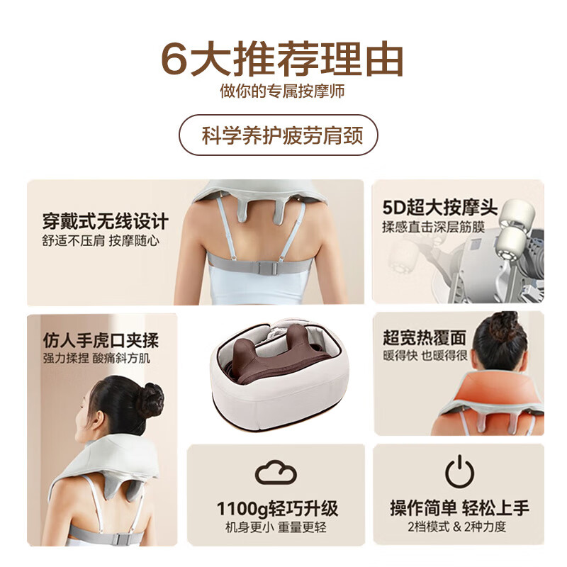 4、产品买来就用了,体验感是不错,就是买好就看到其他优惠力度很大忽然有点买贵了,不过产品是可以的,按摩感力度很大,也很贴和肩劲。