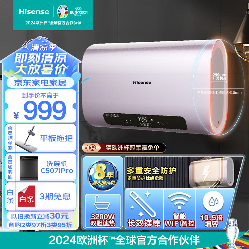 海信(Hisense)纤薄扁桶50升家用电热水器超薄双胆3200W速热变频节能长效镁棒10倍增容WIFI智控W5210i以旧换新价格:1099.00元!