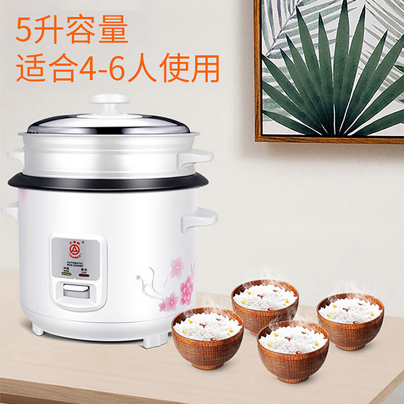 4、外形外观:经典外观,设计简洁,美观大方内胆容量:5升容量,适合4-5人使用,容量大功能配置:机械按键,配置功能简单操作难易:易操作,适合老人使用蒸饭口感:蒸饭,煲粥口感都很好