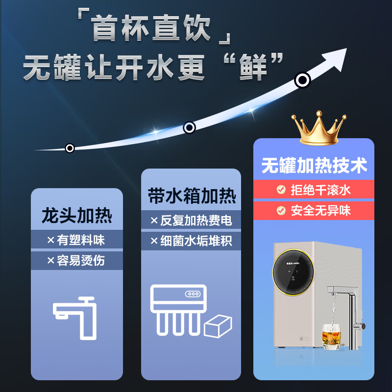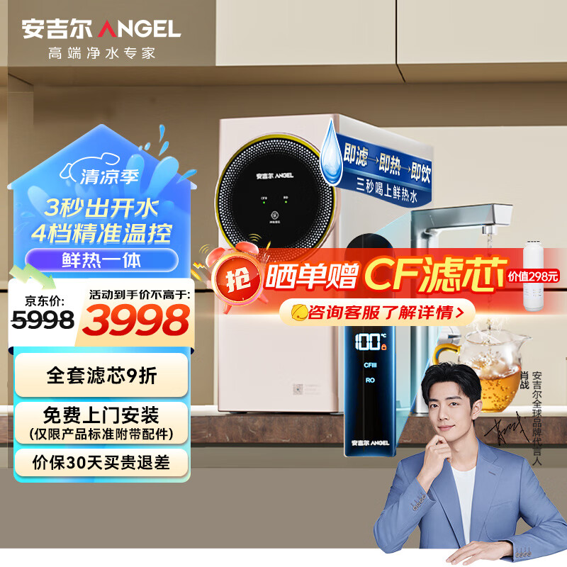安吉尔【肖战代言】E-Tech鲜热一体 家用净水器600G 智显触控龙头 24吨RO反渗透厨下即热直饮2.08L/min价格:3998.00元!