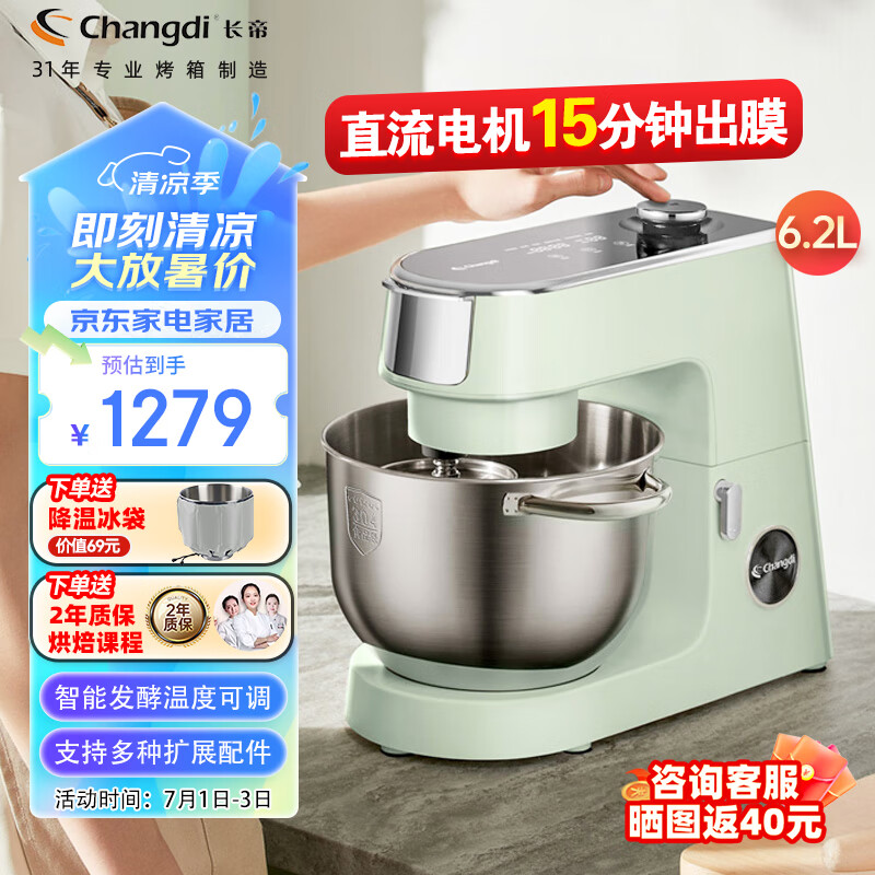 长帝(changdi)家用多功能和面机厨师机 6.2L大容量 顶部大屏触控 直流轻音揉面机面条机 自动发酵 企鹅顶顶 绿价格:1279.00元!