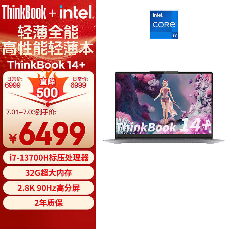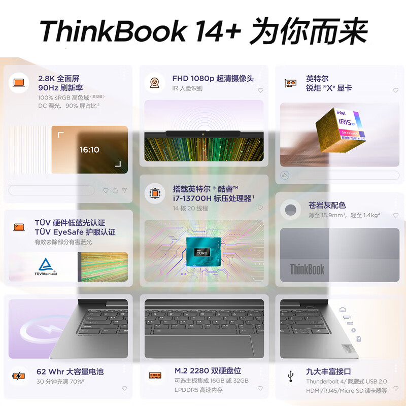 ThinkPad联想笔记本电脑ThinkBook 14+ 英特尔Evo 14英寸轻薄办公本 13代i7-13700H 32G 512G 2.8K 90Hz价格:6499.00元!