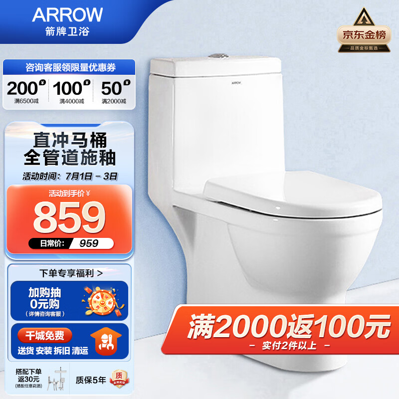 箭牌(ARROW)马桶家用直冲式坐便器大冲力座便坐厕 1级水效 全管施釉AEB12601L价格:989.00元!