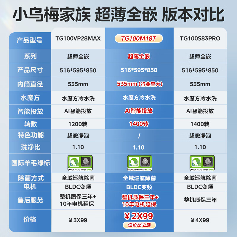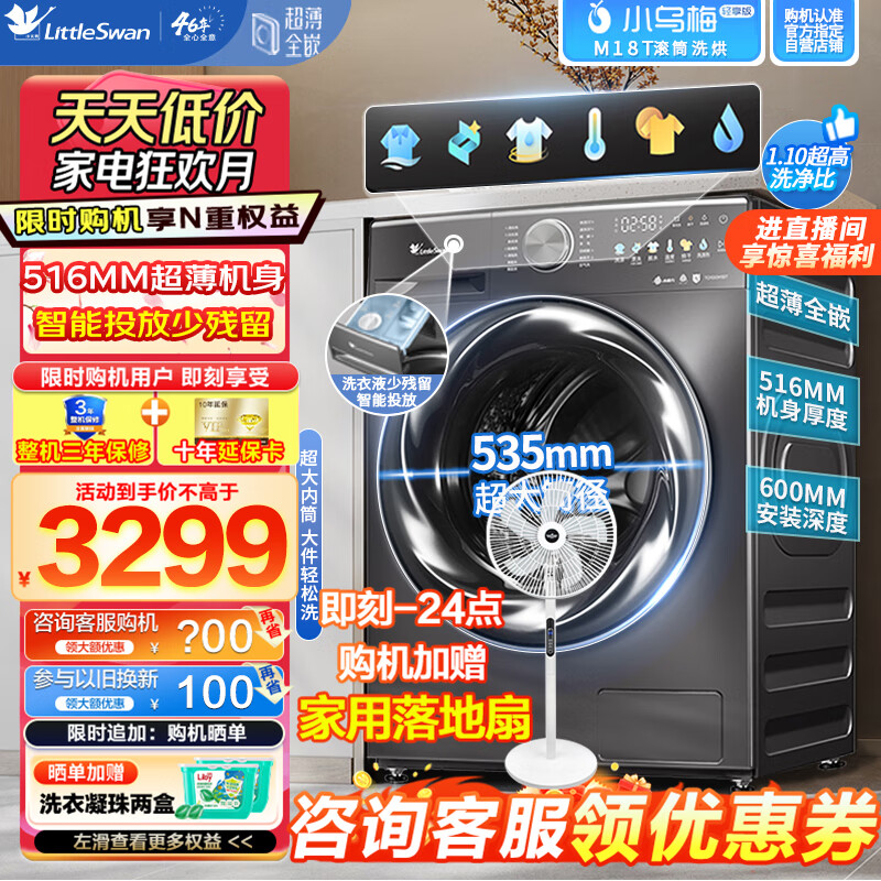 小天鹅(LittleSwan)洗衣机滚筒10公斤小乌梅全自动水魔方智能投放1.1高洗净比超薄全嵌羊毛绿标轻享版M18T价格:3299.00元!
