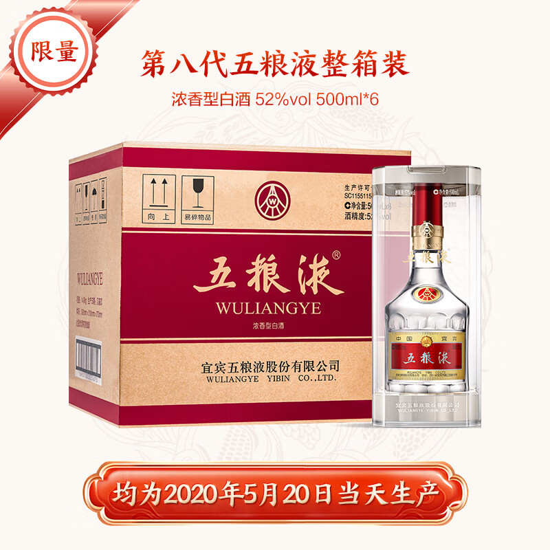 五粮液普五第八代 2020年5月20日生产 浓香型52度 限定整箱装 送礼收藏价格:6499.00元!