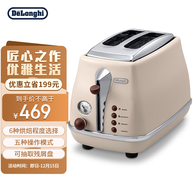 德龙(Delonghi)面包机 复古系列多士炉 不锈钢内胆烤吐司机 家用面包机 烤面包机 CTO2003.VBG 奶油白价格:469.00元!